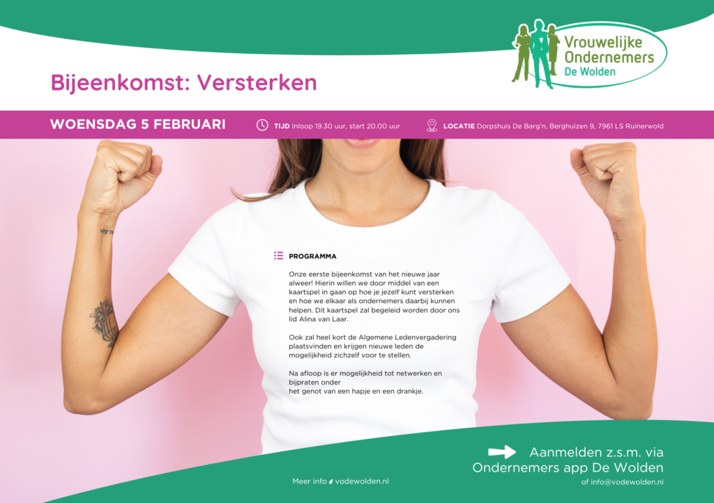 Het thema is Versterken. We willen door middel van een kaartspel in gaan op hoe je jezelf kunt versterken en hoe we elkaar als ondernemers daarbij kunnen helpen. Dit kaartspel zal begeleid worden door ons lid Alina van Laar. Ook zal heel kort de Algemene Ledenvergadering plaatsvinden en krijgen 4 nieuwe leden de mogelijkheid zichzelf voor te stellen.