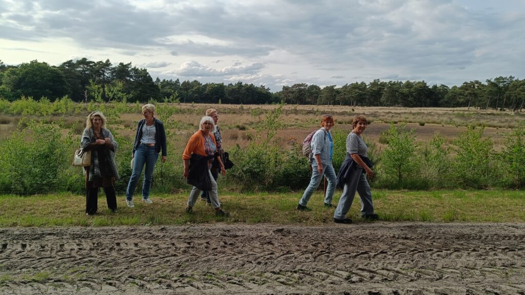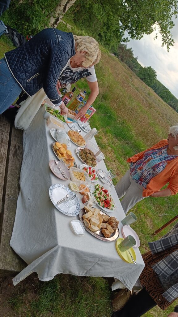 Tijdens de wandeling was er volop gelegenheid voor fijne gesprekken en het uitwisselen van ideeën en plannen. Met een kleine snack onderweg bij elk rode paaltje waren we vaak zo in gesprek dat we de route net konden volgen. Halverwege streken we gezamenlijk neer aan een picknickbank met uitzicht over de hei. Iedereen had iets lekkers meegebracht, wat zorgde voor een gevarieerde en gezellige maaltijd in de open lucht.